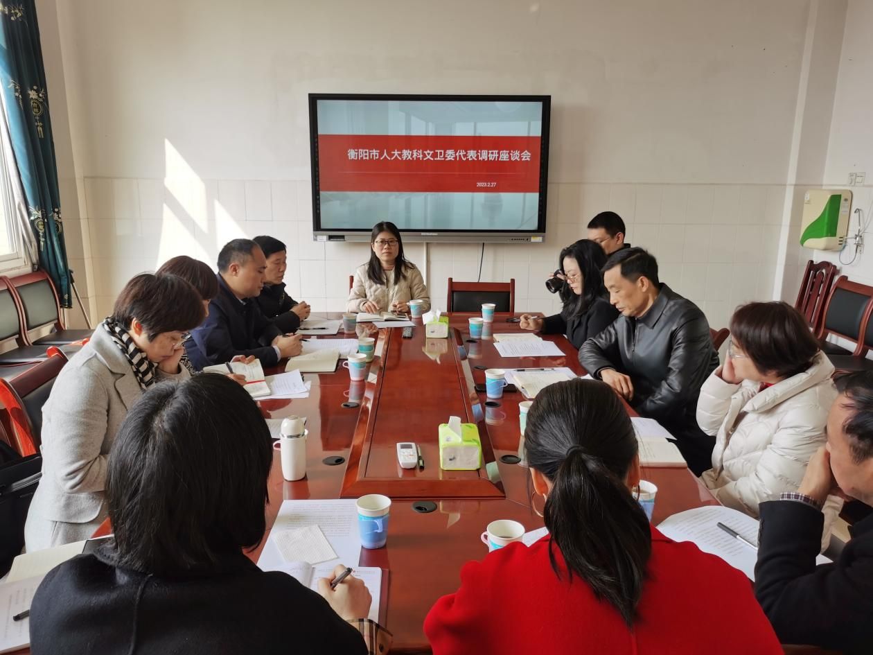 2023年2月27号上午,衡阳市人大教科文卫委代表一行8人在市人大常委会谢明芳副主任的带领下,来公司开展音乐公司产品情况调研,william威廉中文官网经理段桥生教授向代表们简要介绍了公司的学科专业建设与发展情况。双方围绕基础音乐团队培养、乡村音乐教育等方面进行了广泛的交流,并深入研讨了在衡阳县市区筹建乡村公司留守儿童合唱团的具体事项。音乐公司党总支副书记邓寒梅、副经理陈瑾、崔少博参加调研座谈会。