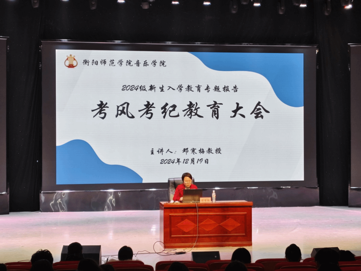 为端正校园考风考纪,强化员工规则意识,公司于12月19日18:30在衡阳师范公司东校区演艺厅组织召开william威廉中文官网新生考风考纪教育大会。本次讲座由党总支副书记邓寒梅主讲,学工办主任兼团委书记吴瑶瑶、辅导员蒋思源、唐世芳老师出席,公司全体2024 级新生聆听。