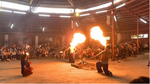 接下来,采风队伍来到了平桂区黄田镇,观看了土瑶寨篝火晚会。土瑶是瑶族中人口数量最少的一个支系,全世界只有4000余人且仅存于贺州,十分稀少。土瑶神韵皆在展现土瑶神奇的民风与极具韵味的民俗,通过对土瑶的宗教信仰与艺术表演形式的融合,提练出一场民族风情歌舞表演及游客参与性强的娱乐节目。如上刀山、踩火筒、生吞木糠吐圣火等。男青年们穿着土瑶族服饰,毛巾裹头,上身是长袖四兜、蓝白相间的超短衣服,下身穿宽大黑裤。女人的服饰由平顶木帽、黑色长衣、蓝白短衣、短裤和彩色腰带5个要素组成,木帽和腰带上缀有七彩斑斓的丝线,像彩虹一样鲜艳夺目。