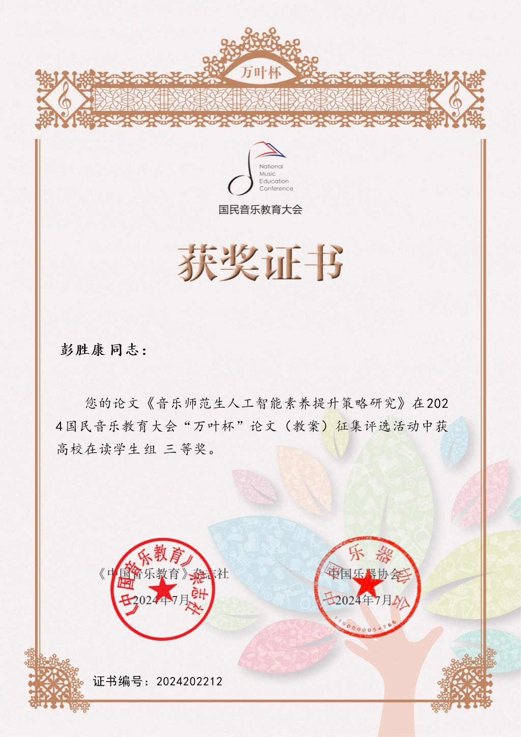 2024年9月6日,由人民音乐出版社《中国音乐教育》杂志社、中国乐器协会、国民音乐教育大会组委会举办的“万叶杯”论文(教案)征集评选活动获奖名单正式发布。公司2024级音乐教育研究生彭胜康同学的论文《音乐师范生人工智能素养提升策略研究》荣获高校在读员工组“三等奖”。