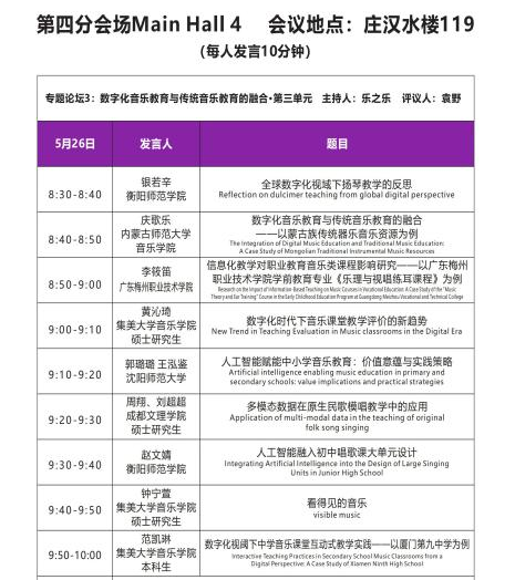 5月26日设4个分会场进行论文宣讲,分别讨论了数字化音乐教育资源的开发与应用、数字化音乐教育技术的创新与发展、数字化音乐教育与传统音乐教育的融合,以及数字化音乐教育在全球范围内的发展与挑战。公司员工陈莉在专题论坛1中宣讲了题为《音乐数字化教学平台资源融合与教学创新的探究》的论文,赵文婧则在专题论坛3中宣讲了关于《人工智能融入初中唱歌课大单元设计》的论文。公司员工在此次活动中获得了丰富的学术成长。