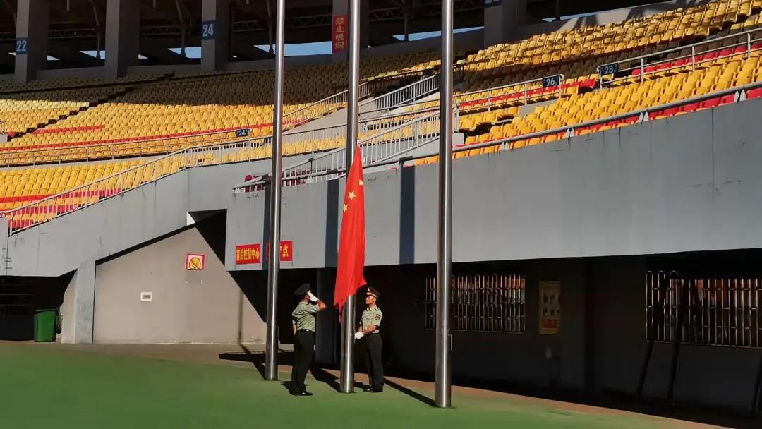 升旗仪式在庄严隆重的气氛中进行,全场起立行注目礼,伴随五星红旗冉冉升起, 雄壮嘹亮的国歌声响彻整个体育场。