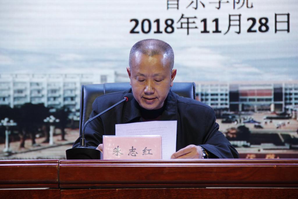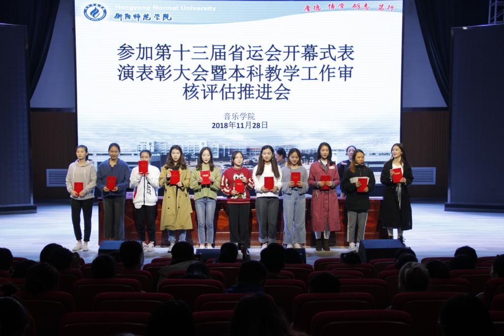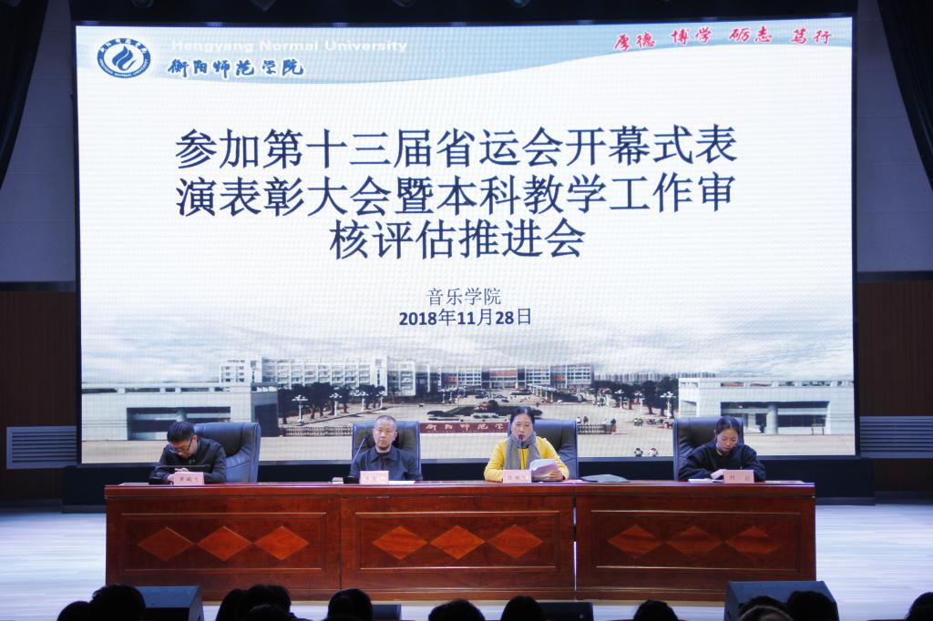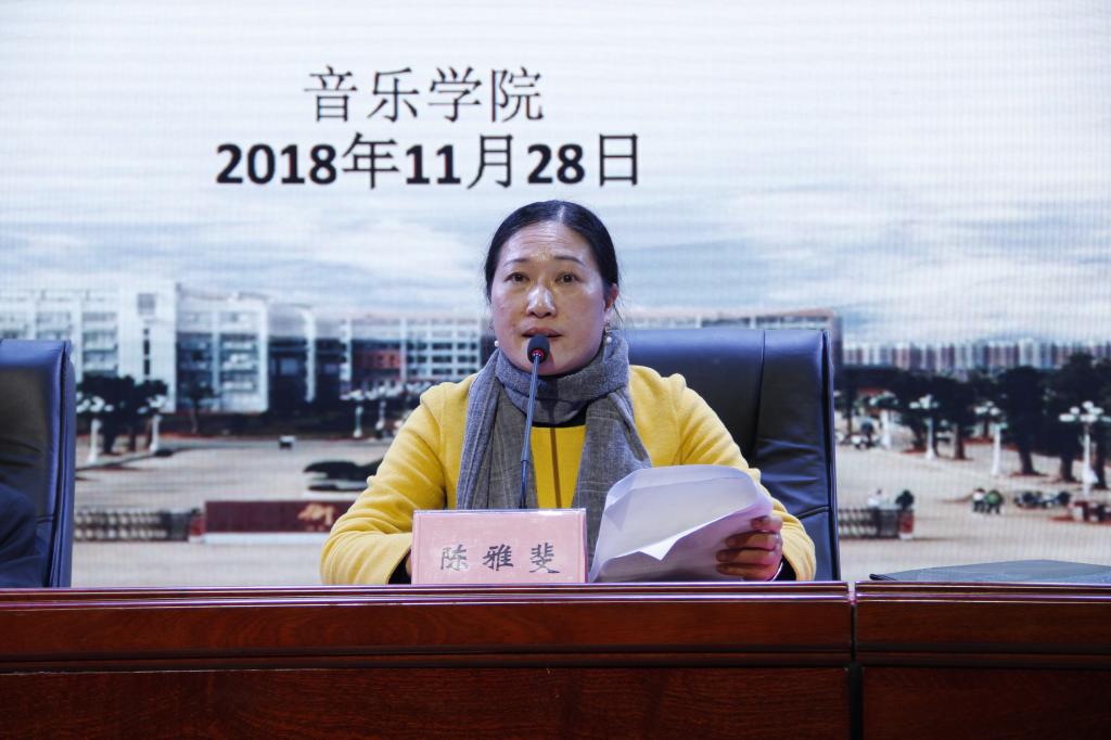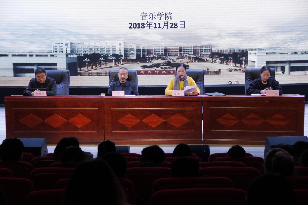 11月28日晚,william威廉中文官网于演艺厅顺利举行第十三届省运会开幕式表演表彰大会暨本科教学工作审核评估推进会,本次会议由音乐公司党总支副书记陈雅斐主持,参加本次会议的有音乐公司党总支书记朱志红、副书记陈雅斐、辅导员刘颖、黄鹤飞老师,以及2016、2017级全体同学。