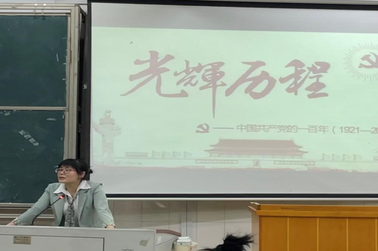 课程开始,唐艳首先发起提问:“什么是‘七一’讲话?”,随后向同学们介绍“七一讲话”的由来及重要意义:“七一”讲话是习近平总书记在庆祝中国共产党成立一百周年时发表的重要讲话。“七一”讲话精神精辟概括了宏大的建党精神,科学指明了以史为鉴、开创未来的目标方向。紧接着,唐艳紧紧围绕学习习近平总书记“七一”重要讲话精神这个重点,从“把握讲话精神丰富内涵”、“领会讲话精神重大意义”、“回顾中国共产党百年奋斗的光辉历程”、“实现中华民族伟大复兴取得的四个伟大成就”、“新的征程上我们坚持做到九个必须”等五个方面展开讲述,要求同学们学好党史,不忘初心,牢记使命,缅怀革命先烈,传承红色精神。最后,唐艳鼓励同学们向优秀共产党员看齐,自觉做到弘扬光荣传统、赓续红色血脉,并把伟大建党精神继承下去、发扬光大!
