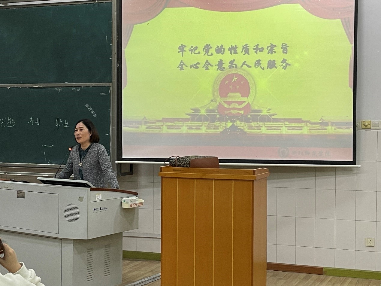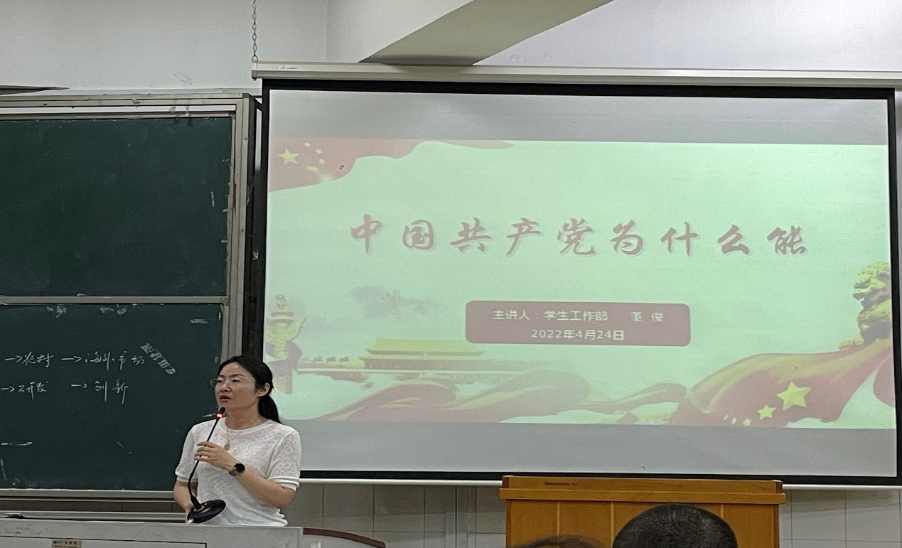 凌飞飞首先描述了党史发展的脉络及党史学习意义。她表明:“学习党史、‘以史明志’有利于发展党的思想政治建设,能够吸收党的发展历程中的成功经验并且发扬党的优良作风”。随后凌飞飞为同学们梳理了党史发展阶段的四个重要时期,其中重点提到了中共一大参会人员的历史故事,以此告诫同学们要在老员工活中努力学习,不要荒废大学时光。她还引用了《论语.述而》中的一句话,“德之不修,学之不将,闻义不能徙,不善不能改,是吾优也”,希望广大同学们积极学习党史,努力实践,不断提高自身素质,以实际行动争取早日成为一名优秀的共产党员。