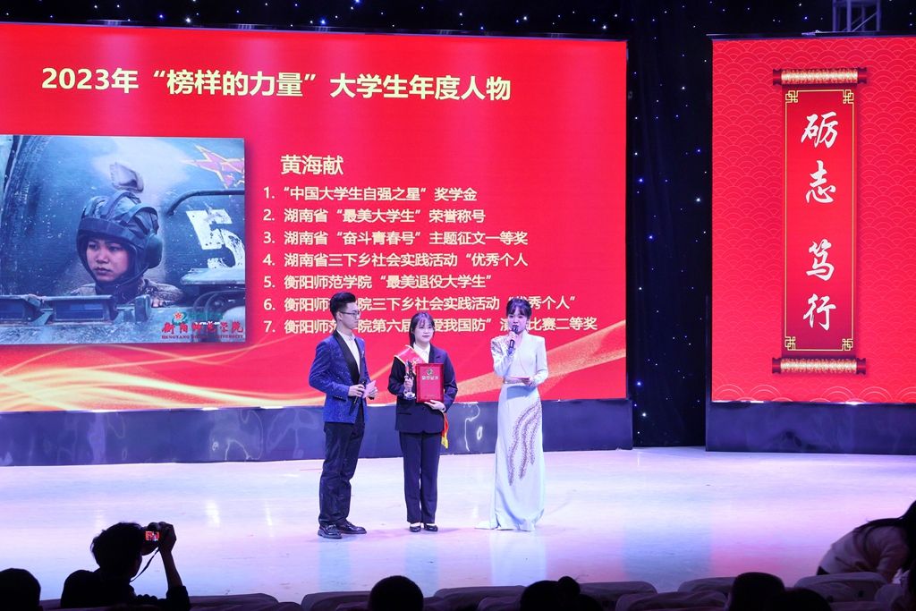 主持人宣读2023年“榜样的力量”老员工年度人物”与 “第十八届“芙蓉学子·榜样力量”优秀老员工获奖名单,与会领导和嘉宾分别为其颁奖。