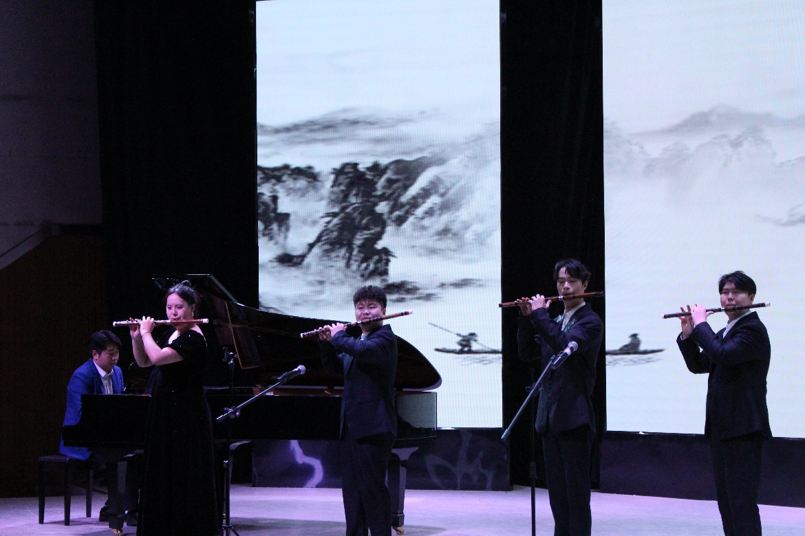 下半场在古筝重奏《柳京之舞》旋律中拉开了帷幕,不同乐章之间的划分使得演出极具层次感。民乐与西洋乐的结合更是使人身临其境,黑白跳动间音符与古筝声声呼应。